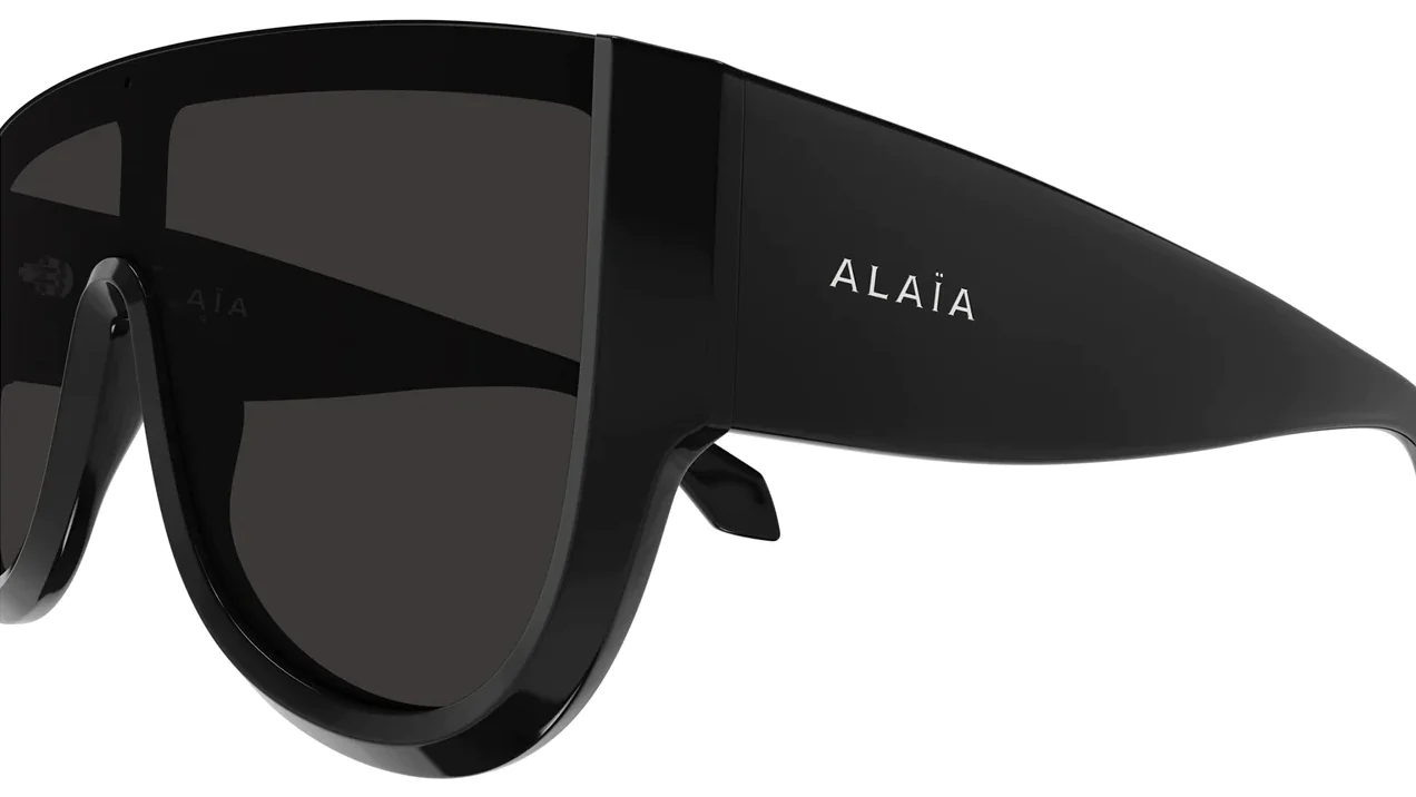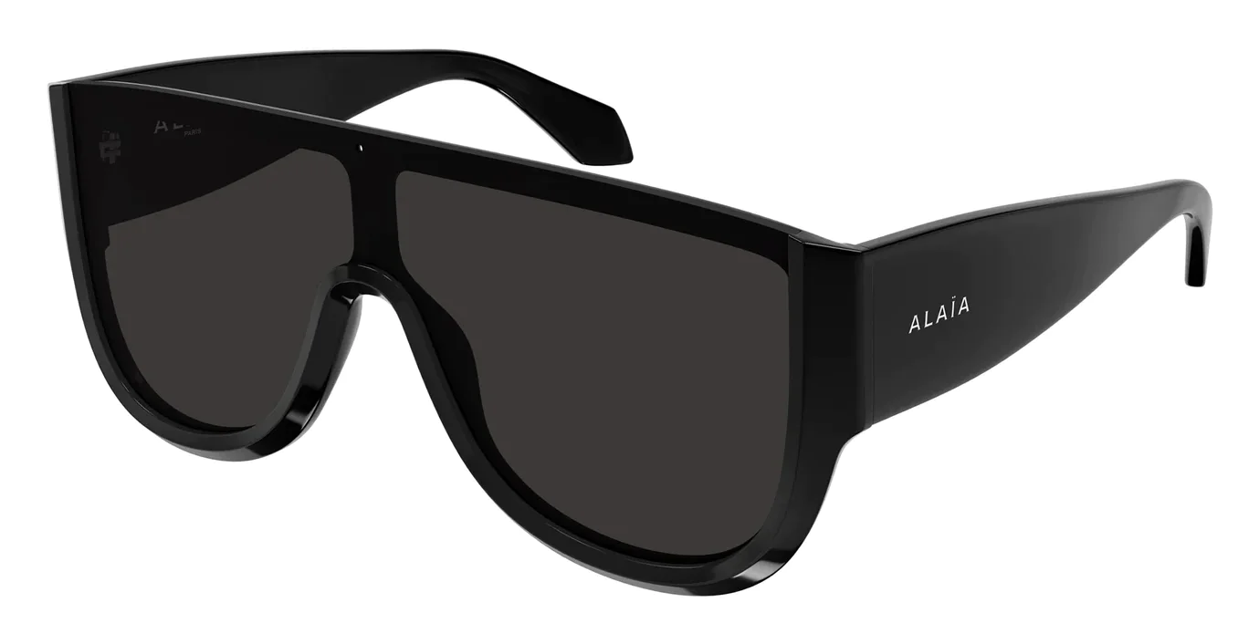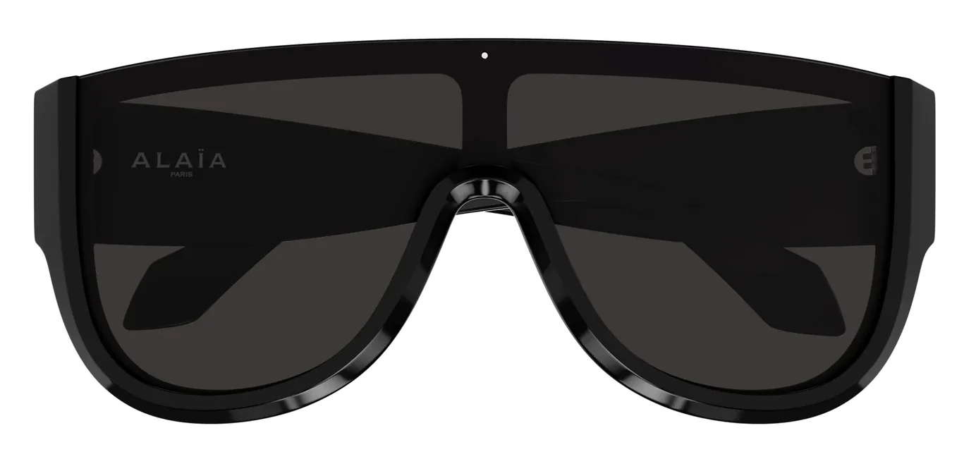 Azzedine Alaïa AA0087S 001 sunglasses for women, featuring shiny solid black shield recycled acetate frame and solid grey mask bio nylon lenses.
